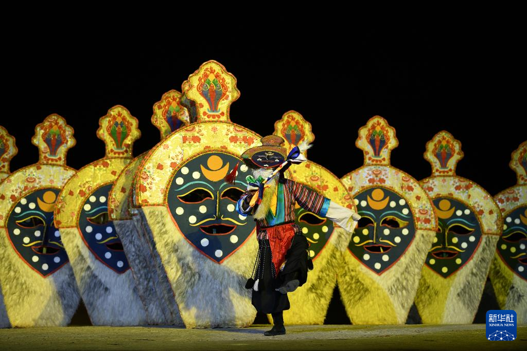 2021年4月10日,演員在大型實(shí)景劇《文成公主》中表演藏戲片段。拉薩布制面具制作技藝西藏自治區(qū)級(jí)非遺傳承人西洛創(chuàng)辦的拉薩市達(dá)孜區(qū)雪鄉(xiāng)扎西崗傳統(tǒng)手工藝合作社多次為該劇提供道具支持。新華社記者 孫瑞博 攝