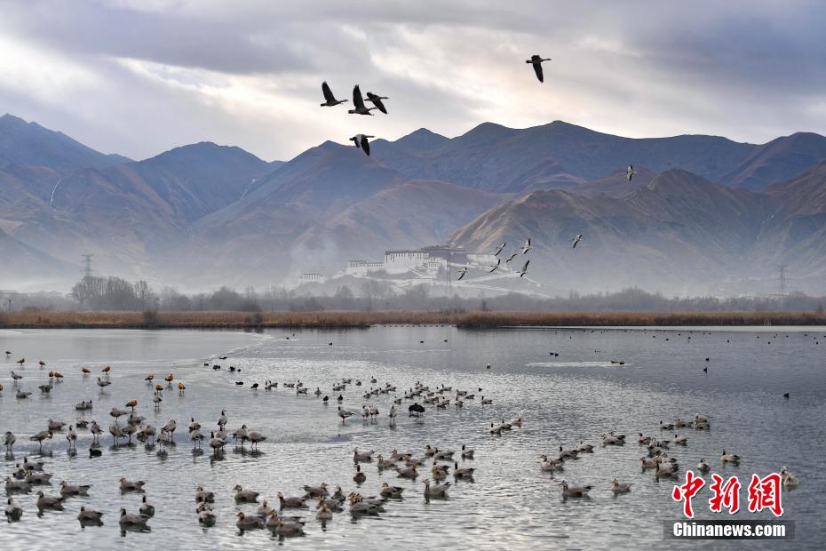 12月29日,冬日早晨,拉薩美如畫(huà)。拉薩河被晨光染成金色,河水靜靜流淌。西藏自治區(qū)拉薩市的拉魯濕地國(guó)家級(jí)自然保護(hù)區(qū)內(nèi),候鳥(niǎo)歡快,忙著覓食、嬉戲。遠(yuǎn)處,布達(dá)拉宮與拉魯濕地相互映襯,構(gòu)成了一幅絕美畫(huà)卷。圖為12月29日,在拉魯濕地越冬的候鳥(niǎo)成群結(jié)隊(duì)。貢確 攝