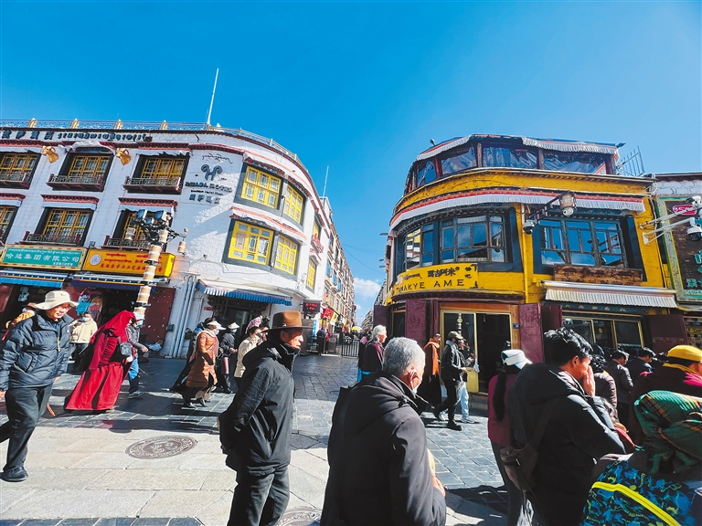 無(wú)論春夏秋冬,八廓街始終熱鬧非凡。每年春、夏、秋三季,國(guó)內(nèi)外游客紛至沓來;冬季,許多來自邊遠(yuǎn)農(nóng)牧區(qū)的群眾會(huì)前來游玩、購(gòu)買年貨。尤其是2024年“冬游西藏”活動(dòng)的開啟,更是讓八廓街的人氣爆棚。走進(jìn)八廓街,周邊的藏式特色建筑、琳瑯滿目的民俗風(fēng)情商品、絡(luò)繹不絕的游客,共同構(gòu)成了一幅獨(dú)特而又和諧的畫面。這里商業(yè)與人文并存、傳統(tǒng)與現(xiàn)代交織,游客們既能感受到文化底蘊(yùn),又能享受到現(xiàn)代商業(yè)的便利和多元。