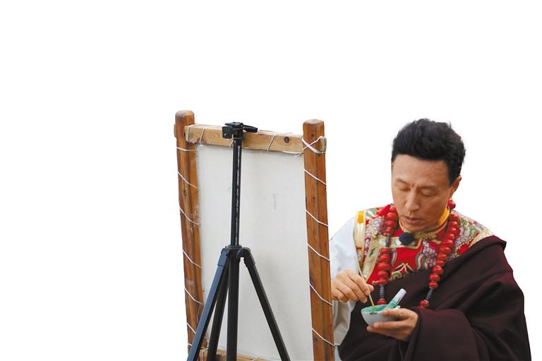 中央廣播電視總臺(tái)“乘著大巴看中國·西藏行”的嘉賓在嘎瑪鄉(xiāng)體驗(yàn)唐卡繪畫。記者 貢秋曲措 攝