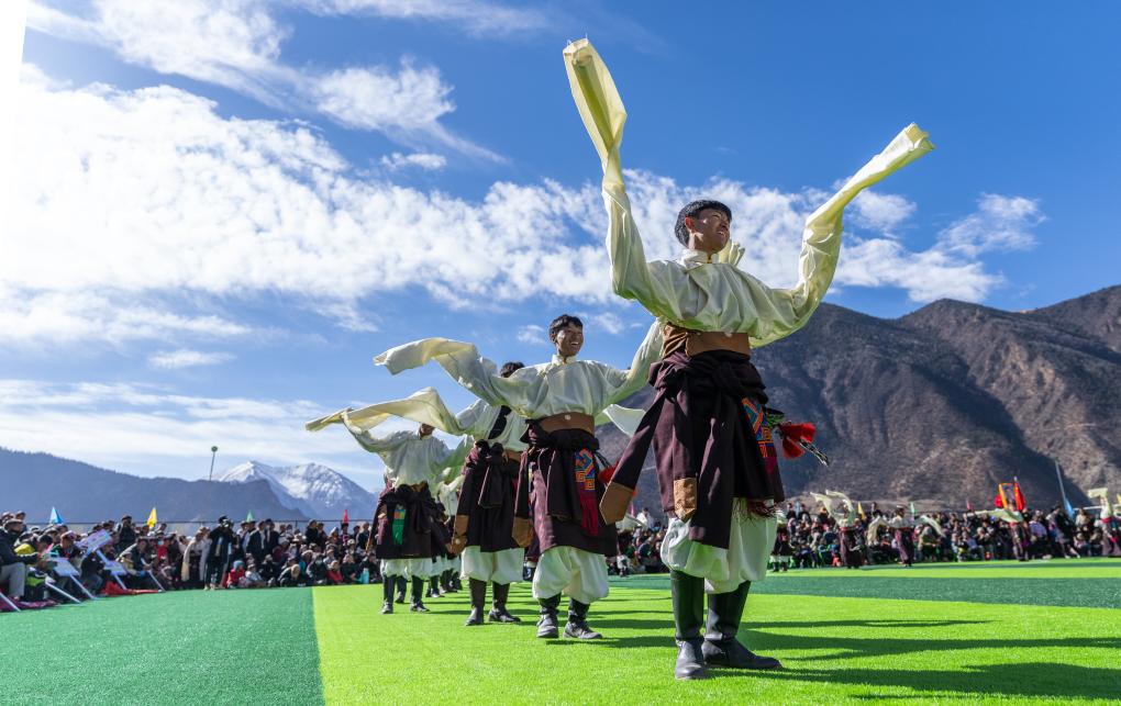 在馬利鎮(zhèn)“云中球場”,當地群眾在球賽開幕式上表演舞蹈(1月2日攝)。新華社記者 丁增尼達 攝