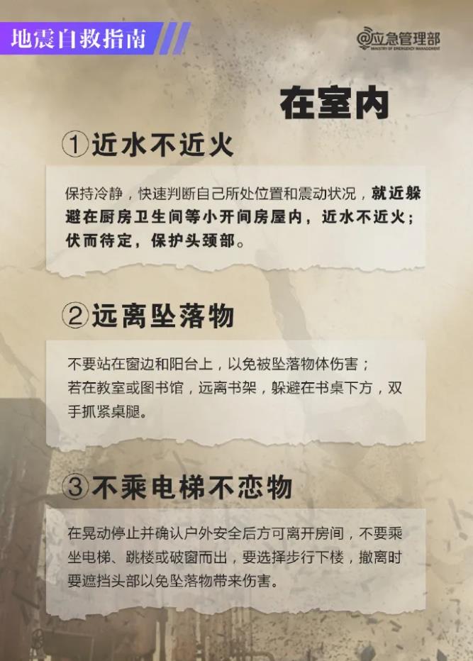 我們要遠離主墻面、門窗和有高大家具的地方,迅速到衛(wèi)生間、廚房等小開間房間躲避,等晃動停止后,再沿消防通道有序疏散,以防后續(xù)余震的影響。疏散時禁止乘坐電梯,也不提倡在有地震的時候,利用繩索逃生。