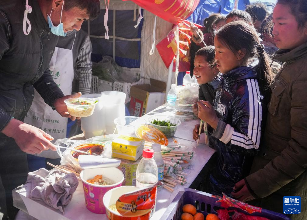 1月8日,在日喀則市定日縣長(zhǎng)所鄉(xiāng)森嘎村的臨時(shí)安置點(diǎn),馬仁(左一)為受災(zāi)小朋友免費(fèi)供應(yīng)面食。據(jù)馬仁介紹,他來(lái)自定日縣,和朋友一起來(lái)臨時(shí)安置點(diǎn)為災(zāi)區(qū)群眾免費(fèi)提供面食。據(jù)悉,從7日下午兩點(diǎn)開始,他們已送出近1200份面食。新華社記者 丁汀 攝