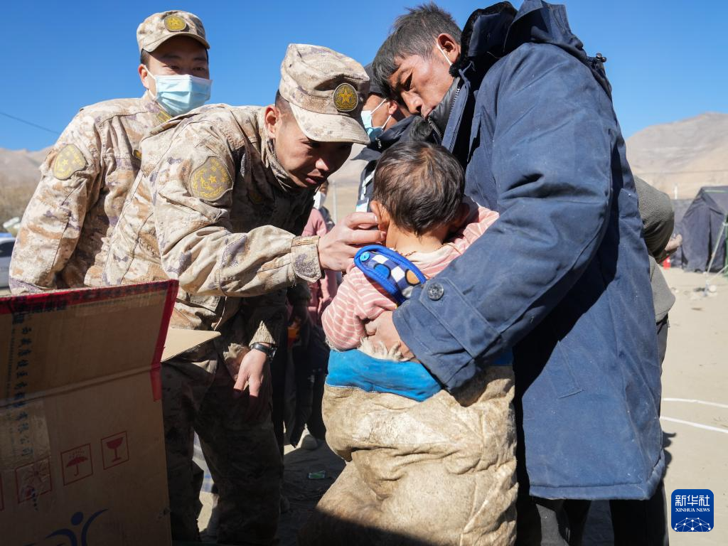 1月8日,在長(zhǎng)所鄉(xiāng)森嘎村臨時(shí)安置點(diǎn),西藏軍區(qū)總醫(yī)院醫(yī)療隊(duì)隊(duì)員為小朋友治療。新華社記者 丁汀 攝