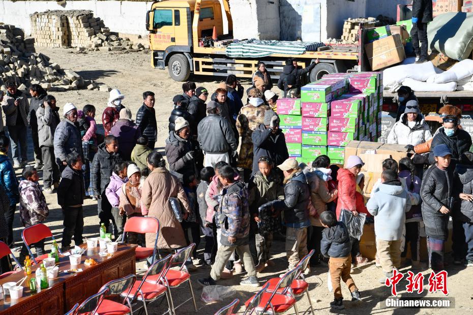 1月9日,西藏自治區(qū)定日縣曲洛鄉(xiāng)措昂村安置點(diǎn),愛心企業(yè)為受災(zāi)民眾發(fā)放生活物資。當(dāng)日,位于西藏自治區(qū)定日縣曲洛鄉(xiāng)措昂村安置點(diǎn),西藏各級救援人員和愛心企業(yè)不斷轉(zhuǎn)運(yùn)、發(fā)放生活物資、搭建安置活動板房、全力保障受災(zāi)民眾的飲食供應(yīng)等,保障受災(zāi)民眾基本生活。中新社記者 貢嘎來松 攝
