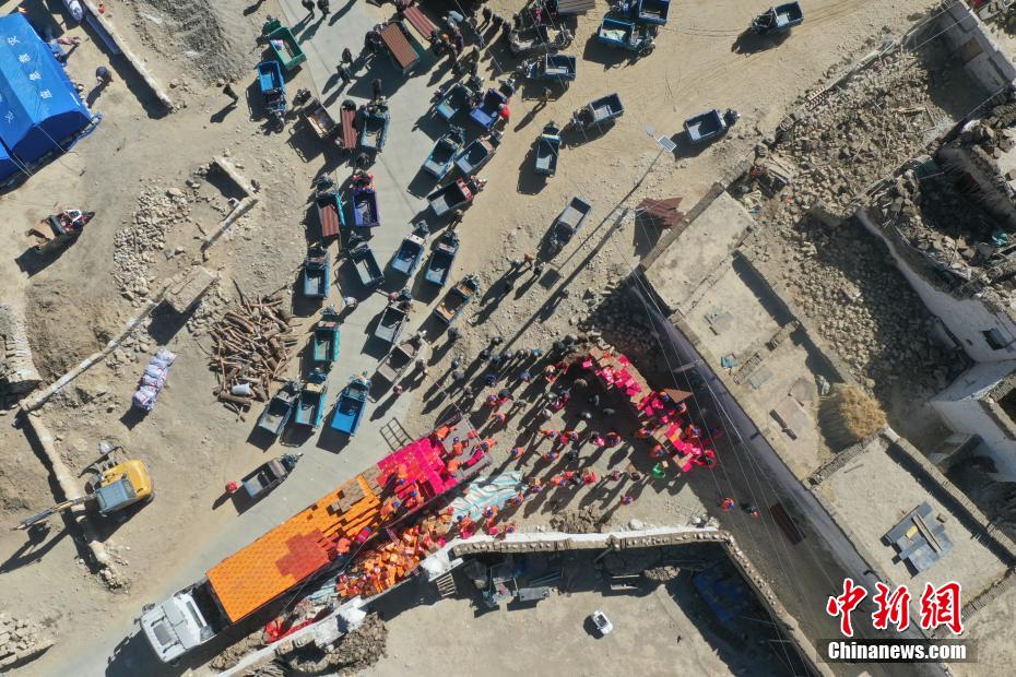 1月9日,西藏自治區(qū)定日縣曲洛鄉(xiāng)措昂村安置點(diǎn),救援人員發(fā)放救災(zāi)物資床墊。當(dāng)日,位于西藏自治區(qū)定日縣曲洛鄉(xiāng)措昂村安置點(diǎn),西藏各級救援人員和愛心企業(yè)不斷轉(zhuǎn)運(yùn)、發(fā)放生活物資、搭建安置板房、全力保障受災(zāi)民眾的飲食供應(yīng)等,保障受災(zāi)民眾基本生活。(無人機(jī)照片)中新社記者 貢嘎來松 攝
