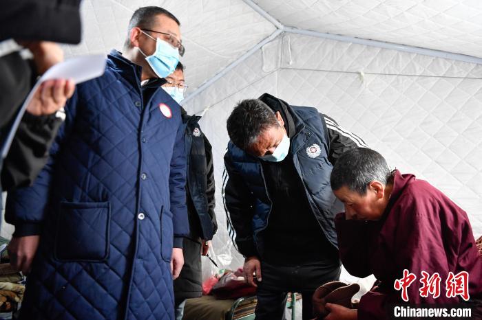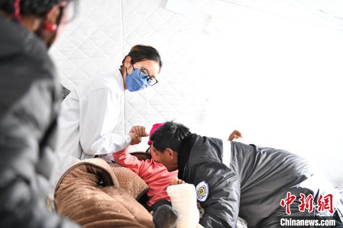 1月10日,西藏定日,醫(yī)護(hù)人員帶老人達(dá)娃的孫女去復(fù)查?!≈行律缬浾?貢嘎來(lái)松 攝