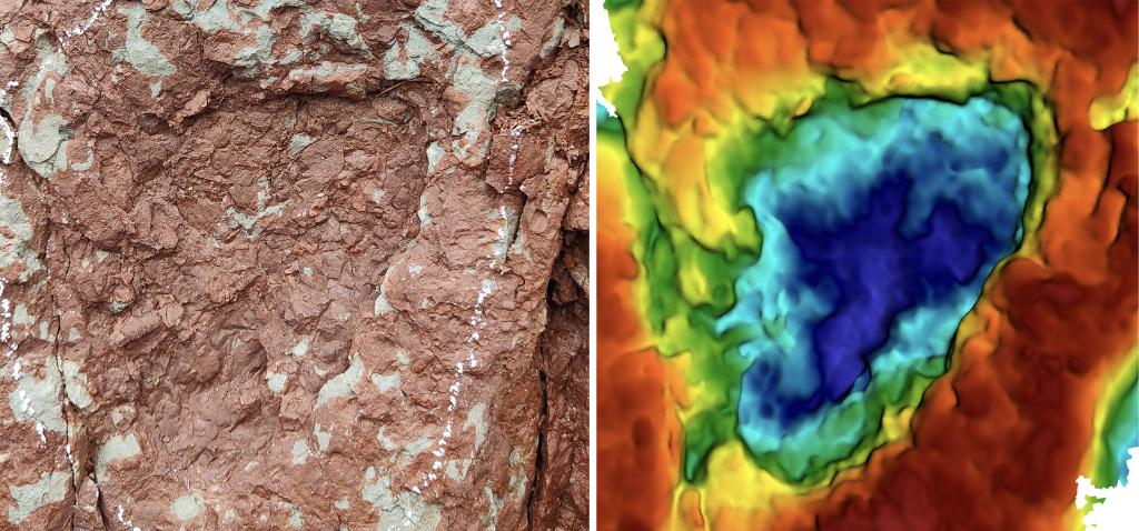 在西藏昌都市凍多村發(fā)現(xiàn)的小型蜥腳類恐龍足跡與3D圖像。(受訪者供圖)