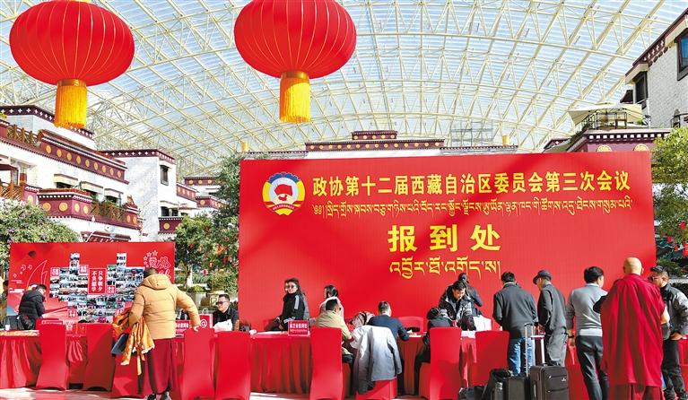 圖為1月16日,參加自治區(qū)十二屆人大三次會(huì)議的人大代表向大會(huì)報(bào)到。記者 唐斌 洛桑 攝