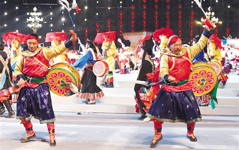 在七市(地)非遺舞蹈整合展示部分,歌舞節(jié)目《鼓潮》將熱巴鼓、背鼓、腰鼓、斯馬卓這四種西藏非遺舞蹈融合在一起,場(chǎng)面氣勢(shì)恢宏,給觀眾帶來(lái)震撼的視覺(jué)盛宴。