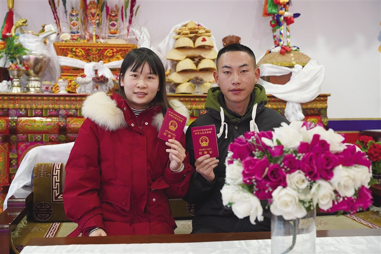 “我們在一起3年了,是表姐牽的紅線?!钡┰龈峦吣樕涎笠缰腋5男θ?,緩緩說道,“初次見到卓嘎,我就對她心生好感。相處一段時間后,我發(fā)現(xiàn)她性格溫柔,和我特別合拍,于是鼓起勇氣向她表白?!彼_心地展示著剛剛領(lǐng)到的結(jié)婚證,“情人節(jié)是個好日子,我們早就計劃好今天領(lǐng)證,現(xiàn)在終于如愿以償。以后情人節(jié)和結(jié)婚紀(jì)念日合二為一,既能少買一份禮物,也不用擔(dān)心忘記啦?!?/p>