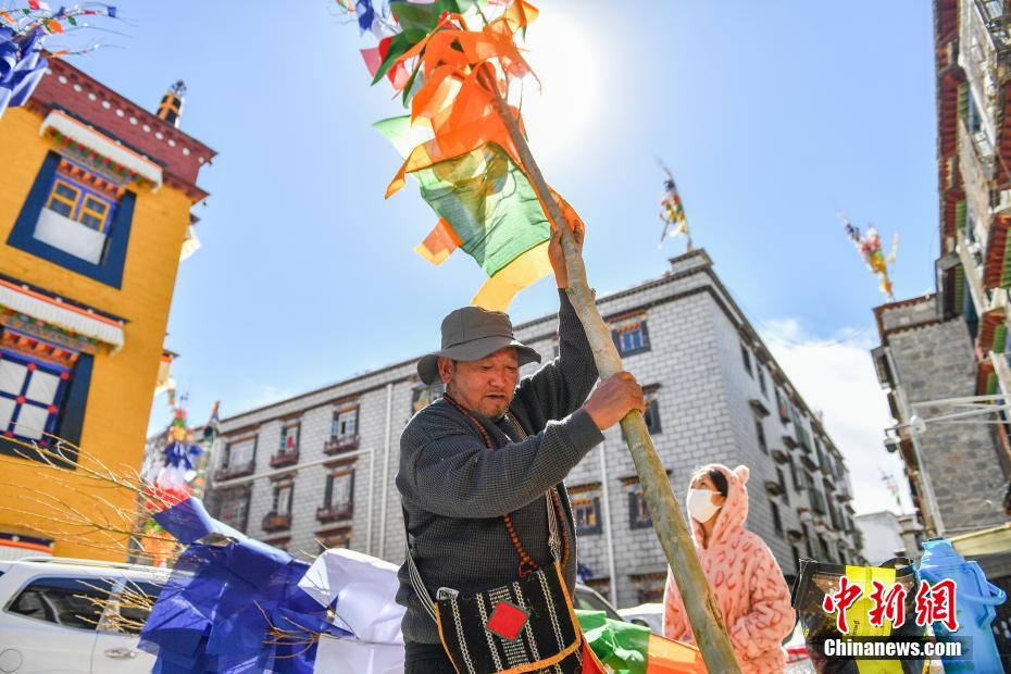 臨近藏歷新年,2月16日,在西藏拉薩街頭,農(nóng)牧民正縫制五彩經(jīng)幡樹。五彩經(jīng)幡樹是藏族民眾在藏歷新年前必備的年貨之一。藏歷新年期間,藏族民眾會選擇一個良辰吉日,為自家的房頂更換五彩經(jīng)幡樹,祈求新的一年里五谷豐登,吉祥如意。圖為2月16日,頓珠正在縫制五彩經(jīng)幡樹。貢確 攝
