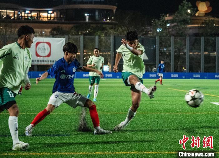 圖為雪域雛鷹隊(duì)隊(duì)員(淺綠衣)和香港東方U16隊(duì)隊(duì)員在場(chǎng)上比拼。中新社記者 侯宇 攝