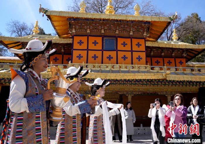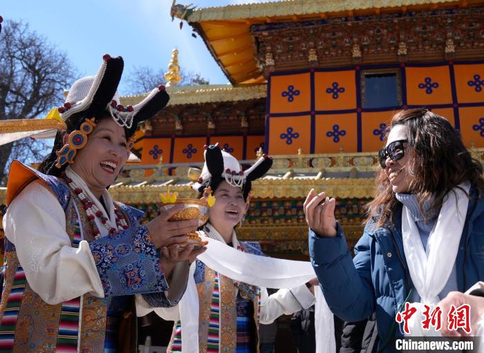 2月20日,由西藏自治區(qū)文化和旅游廳舉辦的2025年香港至拉薩航班首航旅行團歡迎儀式在羅布林卡舉行。來自香港的游客將前往布達拉宮、大昭寺等地,開啟冬游西藏旅途。2月19日,拉薩至香港的首條地區(qū)航線正式開通。航線的開通,更加便捷了兩地居民的出行,也將進一步促進兩地在旅游、文化、經(jīng)貿等領域的交流與合作。圖為歡迎儀式現(xiàn)場,工作人員向香港游客敬獻青稞酒。中新社記者 李林 攝