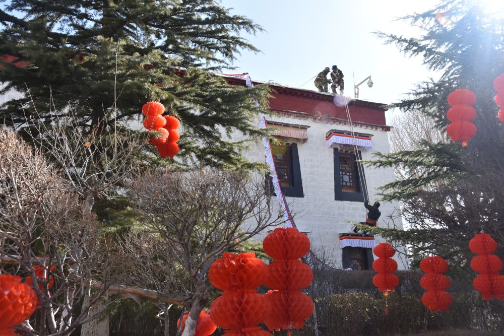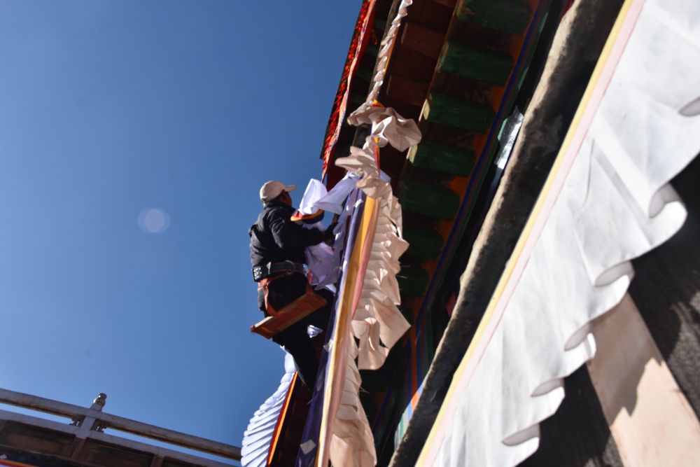 2月28日是藏歷木蛇新年。隨著春天的腳步將近,布達(dá)拉宮迎來(lái)這場(chǎng)特別的“換裝”儀式——更換“香布”?!跋悴肌笔遣厥浇ㄖ难b飾,通常用五彩棉布縫制,主體為白色,搭配紅藍(lán)黃等色的邊沿,對(duì)窗沿等的顏料及木構(gòu)件起到保護(hù)作用。