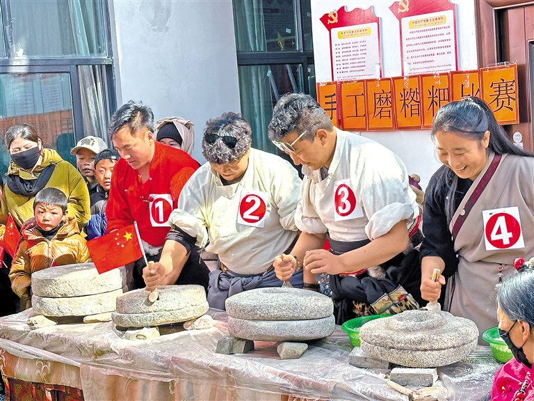 圖為比如縣“鄉(xiāng)村振興 那曲奮進”手工磨糌粑比賽現(xiàn)場。 記者 趙書彬 萬靖 攝