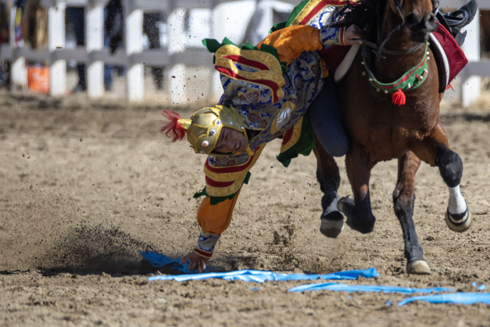 馬術(shù)隊(duì)員在表演“馬上拾哈達(dá)”項(xiàng)目