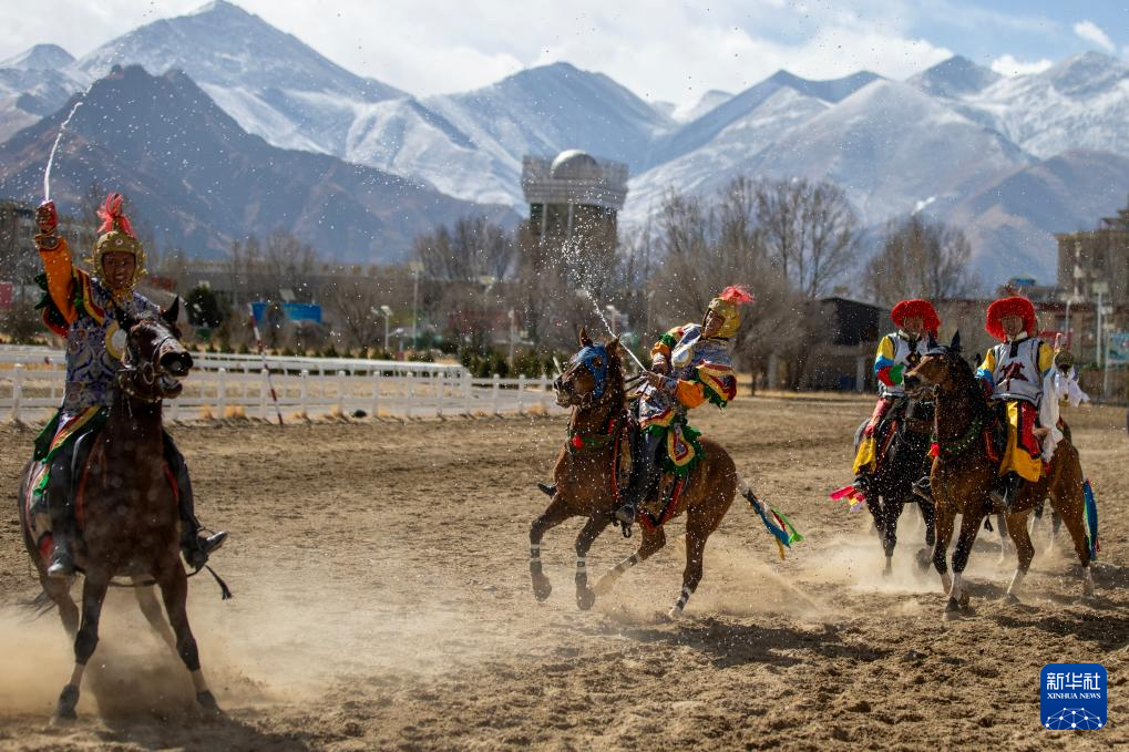 3月2日,馬術(shù)隊(duì)員在重現(xiàn)馬球比賽場(chǎng)景。新華社記者 晉美多吉 攝