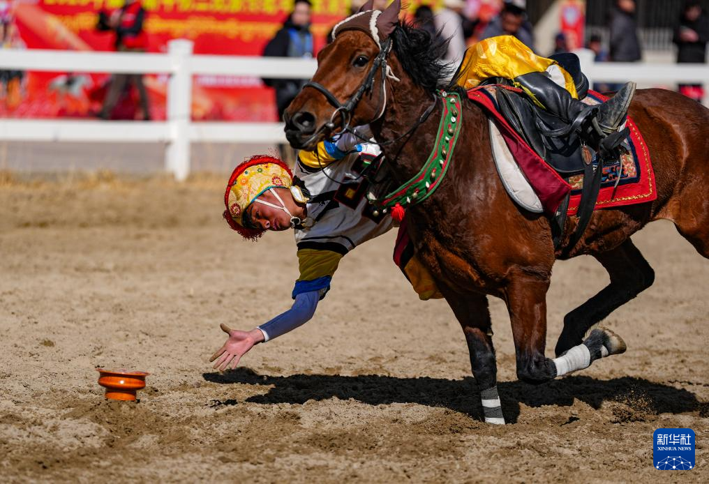 3月2日,馬術(shù)隊(duì)員在表演傳統(tǒng)馬術(shù)項(xiàng)目撿碗。新華社記者 晉美多吉 攝