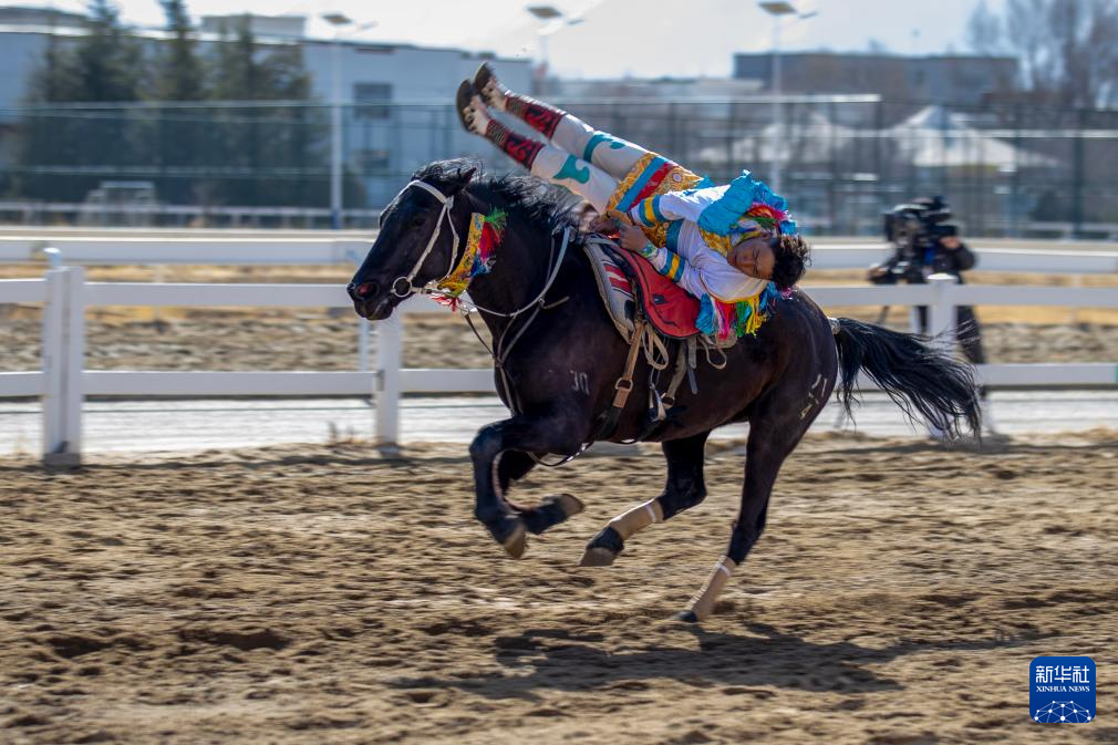 3月2日,馬術(shù)隊(duì)員在表演傳統(tǒng)馬術(shù)項(xiàng)目。新華社記者 晉美多吉 攝