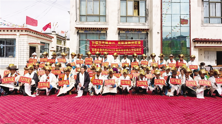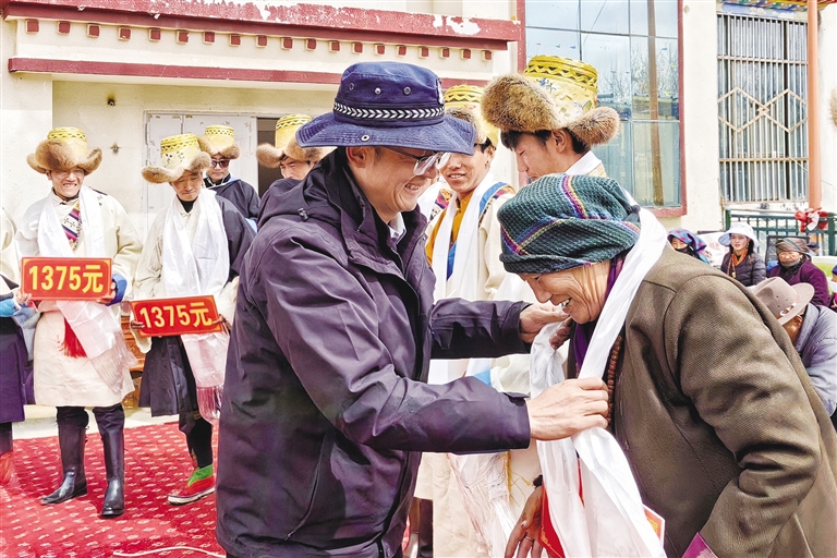 “羅薩扎西德勒!這是您家的分紅款!”定結鄉(xiāng)黨委副書記、鄉(xiāng)長高文雄為75歲的村民央金遞上分紅紅包并表達自己的祝福。長桌上,“卡賽”、青稞酒擺成“豐收塔”;長桌旁,8.8萬元分紅款化作“新年紅包”,村民們揣著紅包看表演,共同分享村集體經濟發(fā)展的豐碩成果,藏歷新年的喜慶與鄉(xiāng)村振興的碩果在此刻交融。