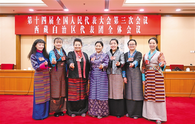 圖為西藏全國人大代表中的“七朵金花”在西藏代表團(tuán)主會(huì)場(chǎng)合影留念,并祝福全區(qū)婦女同胞“三八”國際勞動(dòng)?jì)D女節(jié)快樂。記者 旦增西旦 攝