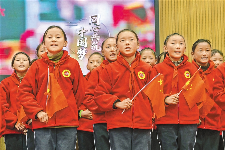 圖為3月5日,來(lái)自受災(zāi)最嚴(yán)重的定日縣長(zhǎng)所鄉(xiāng)、措果鄉(xiāng)、曲洛鄉(xiāng)的3所小學(xué)的學(xué)生在開學(xué)典禮上演唱歌曲《同心共筑中國(guó)夢(mèng)》。新華社記者 姜帆 攝