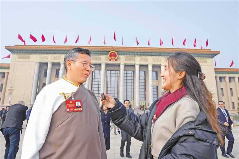 圖為住藏全國政協(xié)委員等參會人員在人民大會堂前合影留念。記者 旦增平措 次旦央吉 攝
