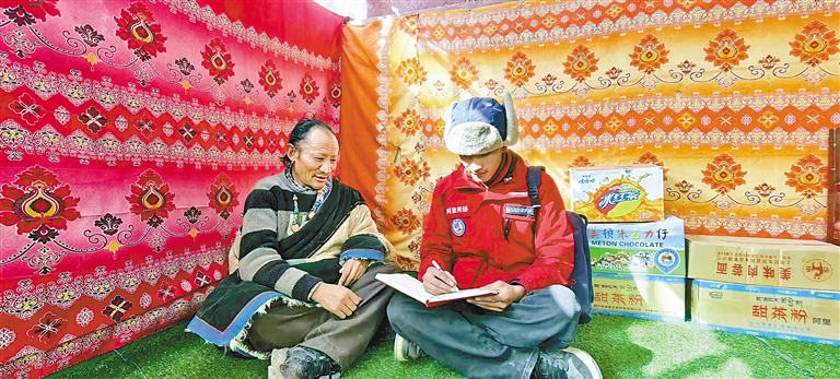 圖為改則縣先遣鄉(xiāng)那日村網(wǎng)格員扎西曲桑(右)入戶采集村民信息。 (圖片由阿里地委政法委提供)
