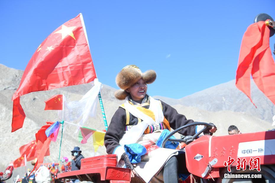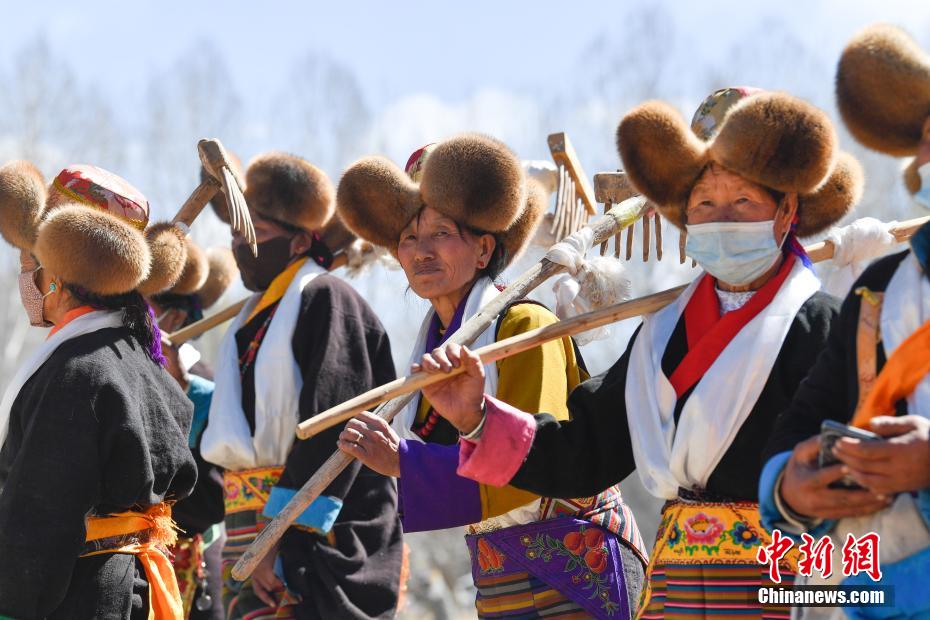 3月16日,西藏拉薩迎來一年一度的傳統(tǒng)春耕儀式。當(dāng)日,拉薩市曲水縣色達(dá)村村民身著節(jié)日盛裝,相聚在田間,載歌載舞,共同迎接春耕第一犁。家家戶戶端著自家的“切瑪”(象征五谷豐登)帶著青稞酒、酥油茶等物品聚在田間,互敬青稞酒,開始撒種,祈求全年風(fēng)調(diào)雨順、五谷豐登。圖為曲水縣色達(dá)村春耕儀式現(xiàn)場,當(dāng)?shù)孛癖姳硌輫壹?jí)非物質(zhì)文化遺產(chǎn)《吉祥仲孜》。中新社記者 貢嘎來松 攝