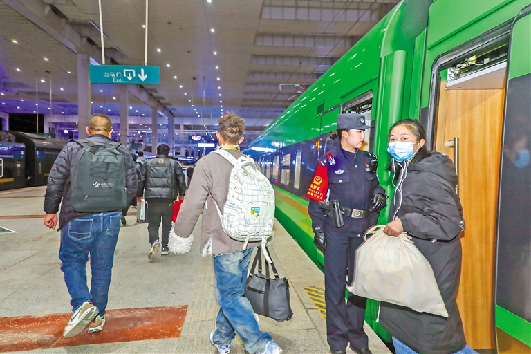 “格桑梅朵”女子乘務組乘警引導旅客平安下車。記者 劉斯宇 通訊員 黃飛 攝