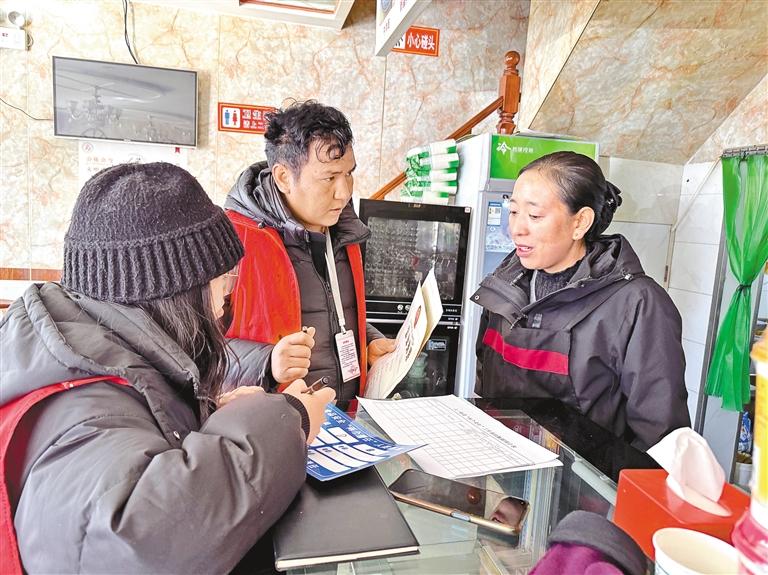 拉薩市城關(guān)區(qū)八一街道當(dāng)熱社區(qū)組織開展食品安全隱患排查工作。這是工作人員在仔細檢查商戶營業(yè)執(zhí)照、食品衛(wèi)生許可證和健康證等持證情況。記者 王敏 攝