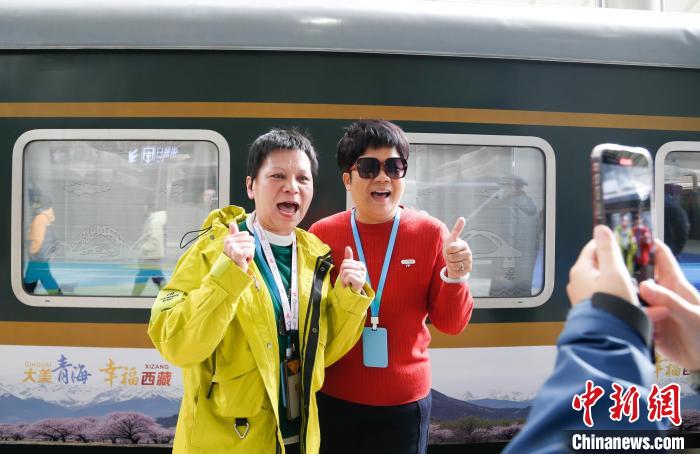 3月26日,乘坐青海首趟直達(dá)西藏林芝旅游專列的旅客與列車合影留念。 馬銘言 攝