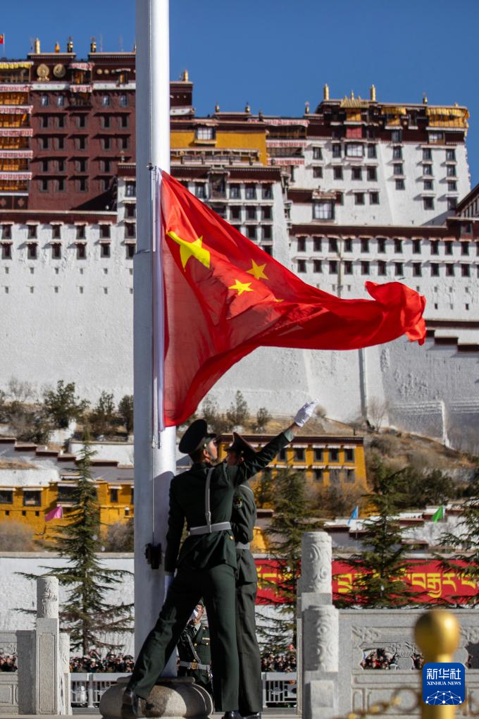 3月28日,拉薩布達(dá)拉宮廣場(chǎng)舉行升旗儀式。新華社記者 姜帆 攝