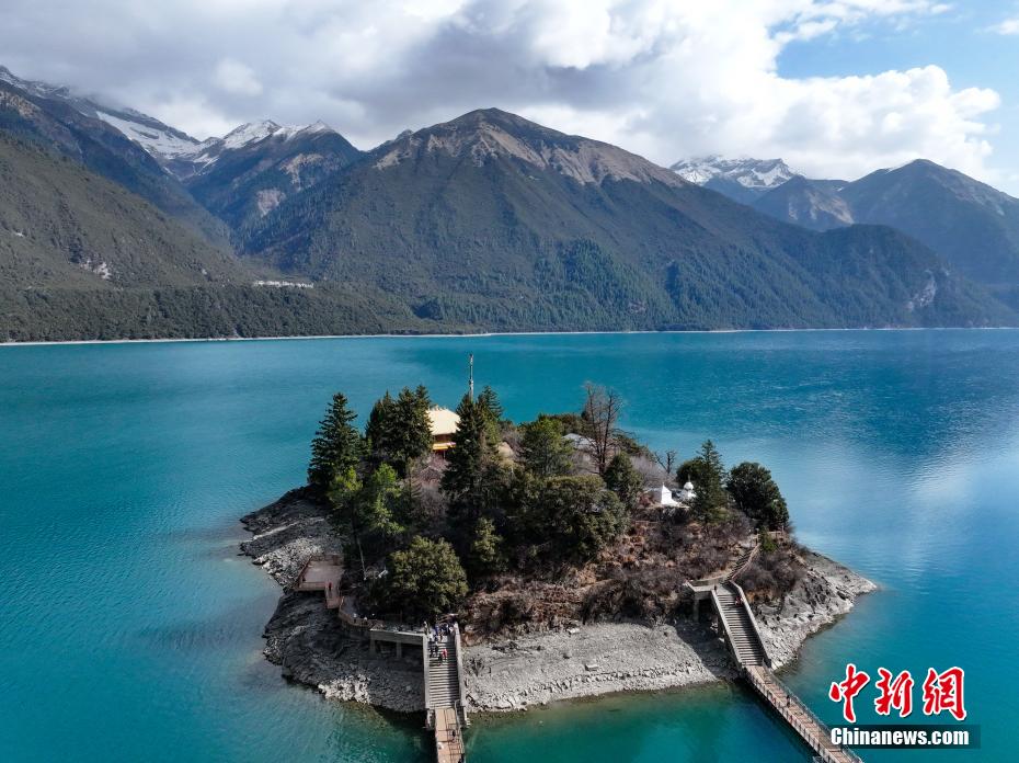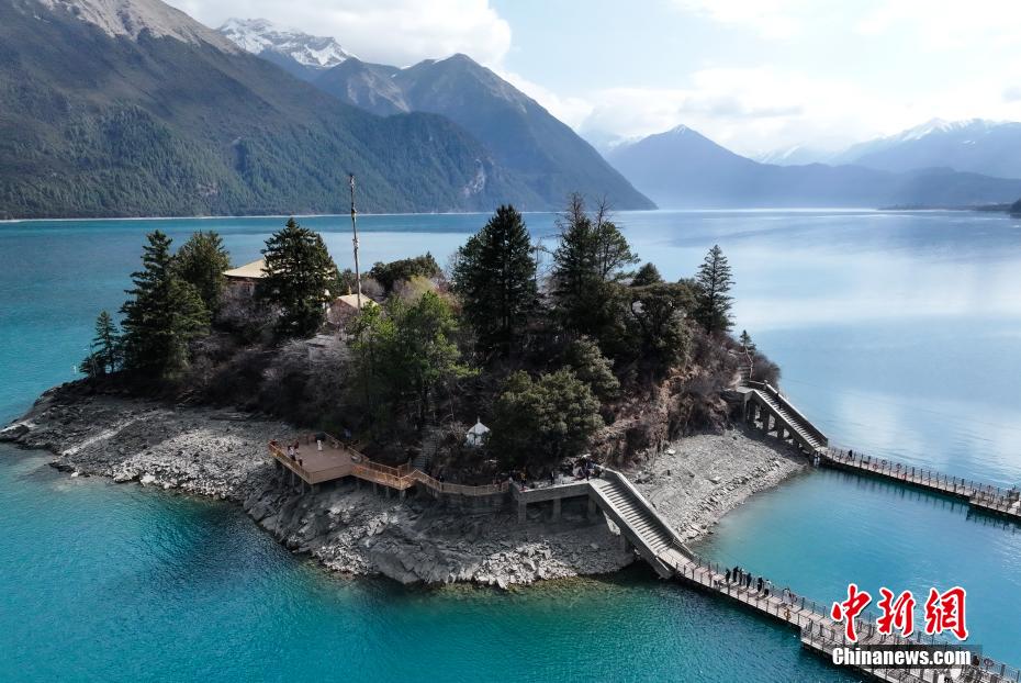 3月30日,航拍巴松措湖心島。巴松措又名錯(cuò)高湖,位于西藏自治區(qū)林芝市工布江達(dá)縣,是西藏首個(gè)自然風(fēng)景類國家5A級(jí)旅游風(fēng)景區(qū)。從空中俯瞰巴松措,碧藍(lán)的湖水被雪山、森林環(huán)繞,宛如鑲嵌在群山間的“藍(lán)寶石”。(無人機(jī)照片)中新社記者 馬銘言 攝