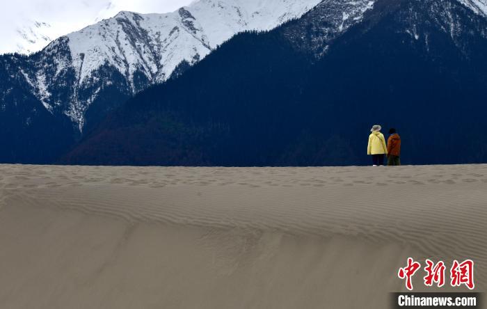 4月4日,游客在西藏米林市丹娘佛掌沙丘景點觀景。當日是清明假期第一天,眾多游客在該地游玩,樂享美好春光。丹娘佛掌沙丘位于米林市丹娘鄉(xiāng),因沙丘倒影在雅魯藏布江中形成雙手合十的形狀,故被譽為佛掌沙丘。中新社記者 李林 攝