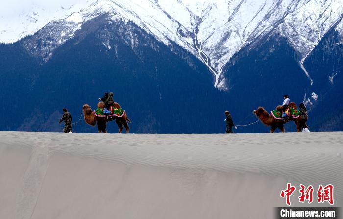 4月4日,游客在西藏米林市丹娘佛掌沙丘景點體驗騎駱駝。當日是清明假期第一天,眾多游客在該地游玩,樂享美好春光。丹娘佛掌沙丘位于米林市丹娘鄉(xiāng),因沙丘倒影在雅魯藏布江中形成雙手合十的形狀,故被譽為佛掌沙丘。中新社記者 李林 攝