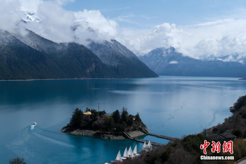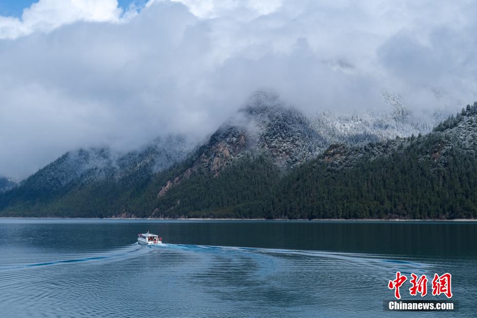 巴松錯(cuò)位于西藏林芝工布江達(dá)縣境內(nèi),地處巴河上游的高山峽谷中,是西藏首個(gè)自然風(fēng)景類國家5A級(jí)旅游景區(qū)。4月5日,巴松錯(cuò)迎來一場春雪,雪后四周原始森林猶如蒙上潔白面紗,湖面宛如一面藍(lán)寶石鑲嵌其中,風(fēng)光如畫。圖為4月5日,游客乘船游覽巴松錯(cuò)。中新社記者 江飛波 攝