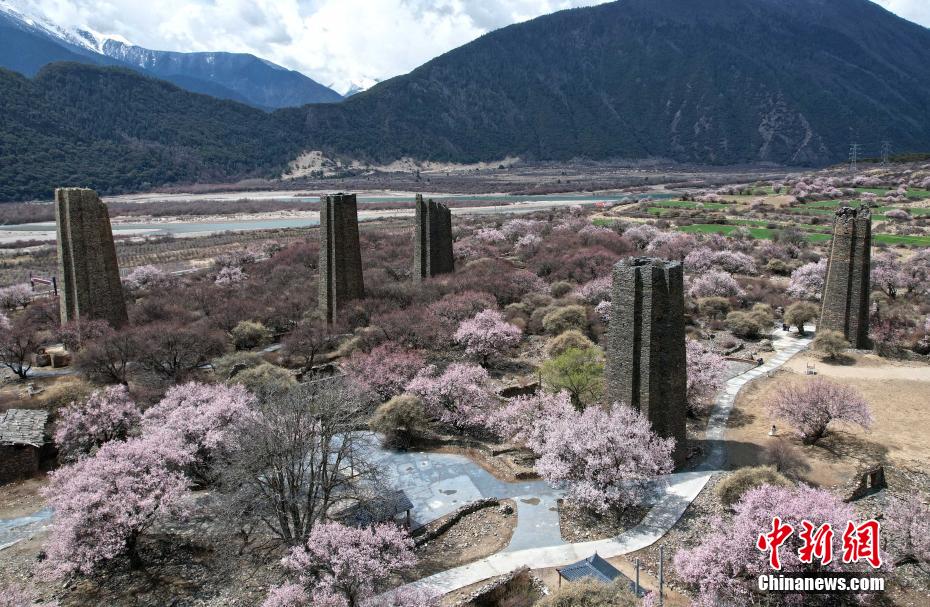 秀巴古堡位于西藏林芝市工布江達(dá)縣,是古代的軍事設(shè)施,距今已有1600多年的歷史。時(shí)下,古堡之下遍布的桃花競(jìng)相綻放,粉白桃花點(diǎn)綴著滄桑古堡,景色壯麗。圖為4月5日,秀巴古堡群下桃花綻放。(無(wú)人機(jī)照片)中新社記者 李林 攝