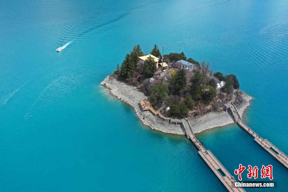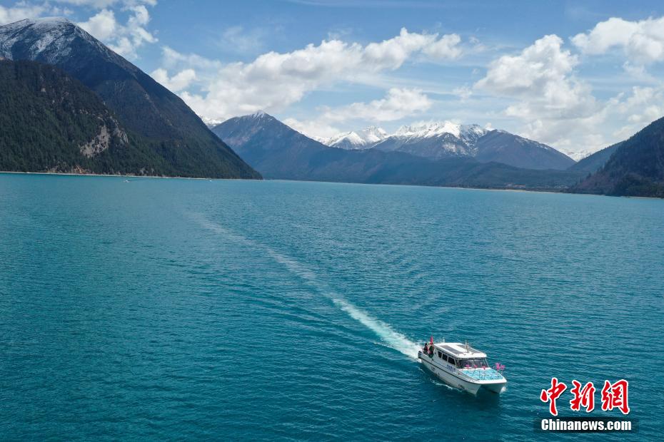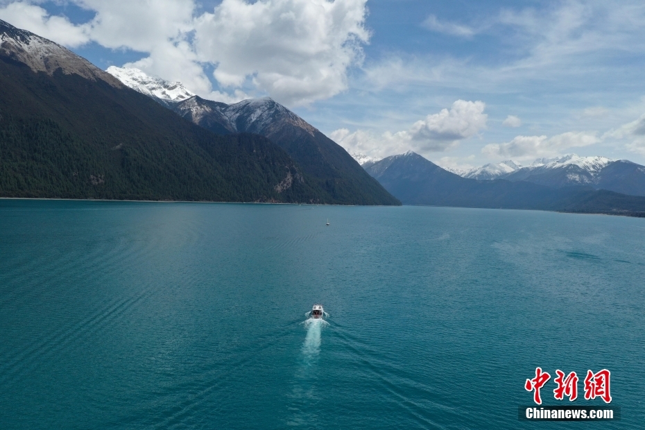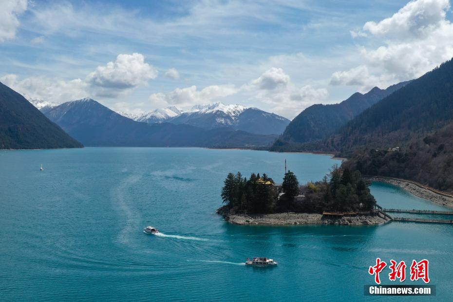 4月6日,西藏林芝工布江達(dá)縣巴松措景區(qū)游人如織。春日里,湛藍(lán)湖水與巍峨雪山相映成趣,游客游玩湖心島或乘船游覽,沉醉在這湖光山色中。圖為巴松措里的游船。(無(wú)人機(jī)照片)中新社記者 貢嘎來(lái)松 攝