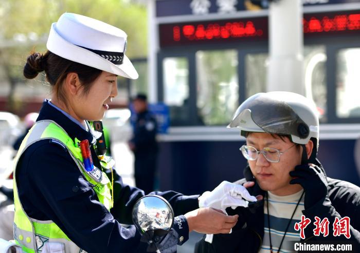 圖為拉薩市公安局交警支隊城北大隊副大隊長胡花芳為駕駛員調節(jié)頭盔。李林 攝