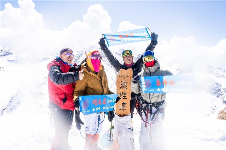 當(dāng)部分山友抵達(dá)洛堆峰一處近60度坡度冰面時(shí),太陽(yáng)緩緩升起,金色的陽(yáng)光照射在山友們身上,寒冷、缺氧時(shí)刻考驗(yàn)著每一個(gè)人,但大家邁著堅(jiān)定的步伐繼續(xù)攀登。經(jīng)過(guò)數(shù)小時(shí)的攀登,來(lái)自西藏民族大學(xué)體育學(xué)院的3名學(xué)生,最先沖頂成功。隨后,陸續(xù)有山友安全挺進(jìn)洛堆峰海拔6010紀(jì)念碑處。大家共同見(jiàn)證了雪山之巔的壯麗風(fēng)景。