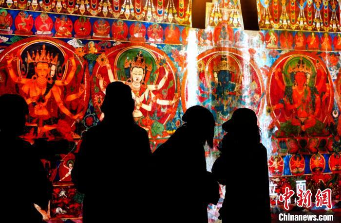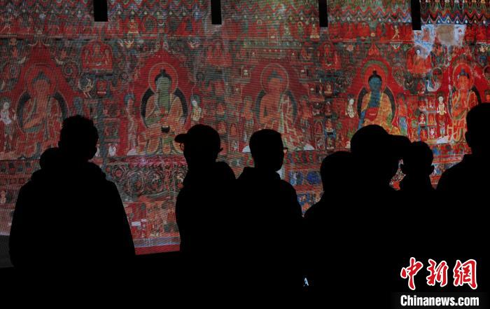 5月18日是第49個(gè)國(guó)際博物館日,今年的主題是“快速變化社會(huì)中的博物館未來(lái)”,西藏博物館迎來(lái)參觀熱潮。圖為觀眾在西藏博物館內(nèi)欣賞阿里古格經(jīng)典壁畫(huà)數(shù)字化成果展。中新社記者 李林 攝