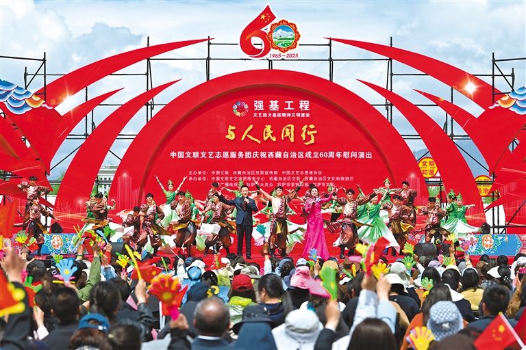 上午10時(shí)整,“與人民同行”中國(guó)文聯(lián)文藝志愿服務(wù)團(tuán)慶祝西藏自治區(qū)成立60周年慰問演出,在歌舞《鼓舞西藏》的熱烈氛圍中正式開場(chǎng)。