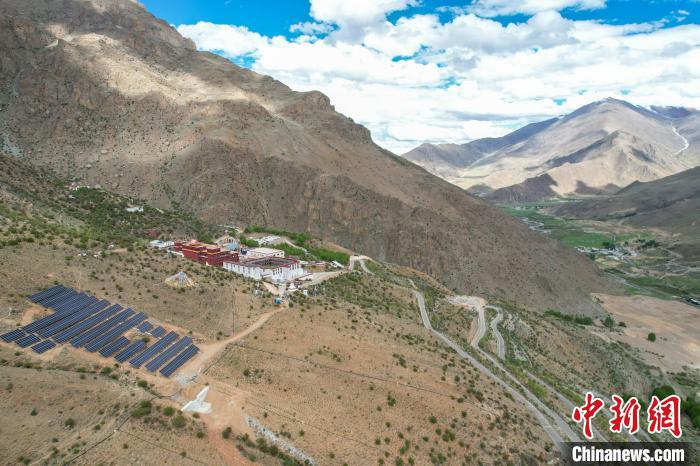 5月29日,航拍拉薩乃朗寺光伏電站,該電站年發(fā)電量約100萬千瓦時(shí),并配備光儲(chǔ)充一體化系統(tǒng),可完全滿足寺廟的使用需求。(無人機(jī)畫面)中新社記者 江飛波 攝