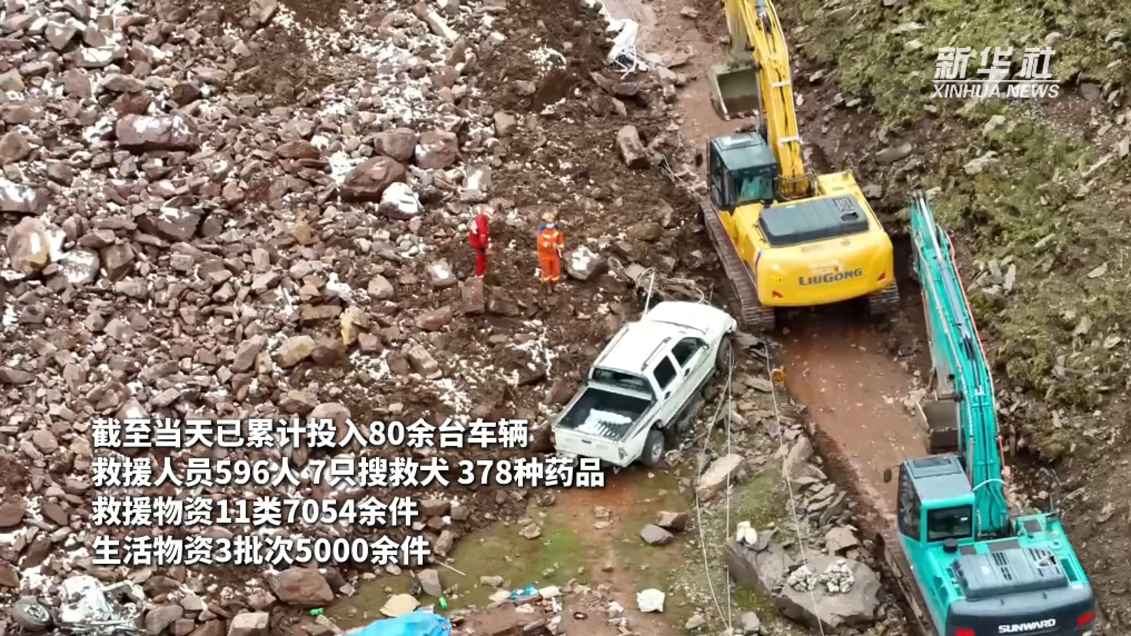 事件發(fā)生后,各方救援力量趕赴現(xiàn)場,開展救援工作。6月5日上午6時(shí),搜救挖掘繼續(xù)開展,截至5日18時(shí)已累計(jì)投入80余臺(tái)車輛、596人、7只搜救犬、378種藥品、救援物資11類7054余件、生活物資3批次5000余件。清理堆積體約5000方,挖掘出2輛汽車,搜尋到3名遇難者遺體,未搜尋到7名失聯(lián)人員。