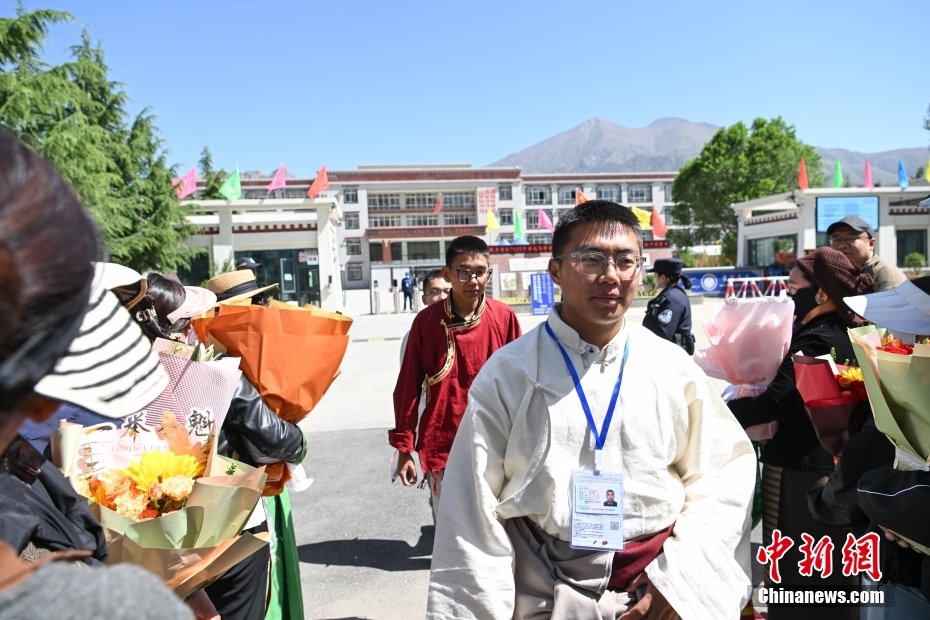 6月9日,西藏拉薩江蘇實驗中學考點外親友為考生送上哈達。當日,西藏自治區(qū)2025年普通高考完成所有科目考試,2025年西藏高考落下帷幕。中新社記者 貢嘎來松 攝