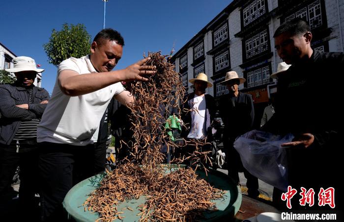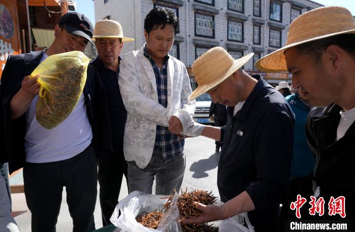 圖為6月13日,蟲(chóng)草商通過(guò)揣袖議價(jià)的方式購(gòu)買(mǎi)冬蟲(chóng)夏草。中新社記者 李林 攝