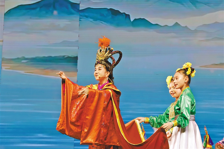 舞臺中央,12歲的其美卓嘎身著錦繡華服,以清亮唱腔和靈動演繹,將文成公主的溫婉堅毅展現(xiàn)得淋漓盡致?!爱斘掖┥蠎蚍?、唱起‘漢藏情誼潔如璧’時,仿佛真的穿越到千年前的和親之路?!毖莩鼋Y(jié)束后,小姑娘眼中閃爍著興奮的光芒,“原來民族團結(jié)的故事,就藏在這些古老而動人的戲文里。”其父親倫珠難掩自豪:“文成公主促進了漢藏交融,女兒能表演這個節(jié)目,用藏戲詮釋民族團結(jié),是我們?nèi)业尿湴粒 ?/p>