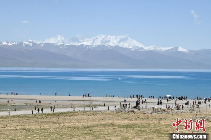 6月26日,隨著氣溫逐漸升高,西藏納木錯迎來旅游旺季。納木錯,藏語意為“天湖”,位于西藏自治區(qū)中部,拉薩市當雄縣和那曲市班戈縣之間,面積超2000平方公里,湖面海拔4718米,是世界海拔最高的大型咸水湖。圖為游客在納木錯湖邊拍照留念。中新社記者 貢嘎來松 攝